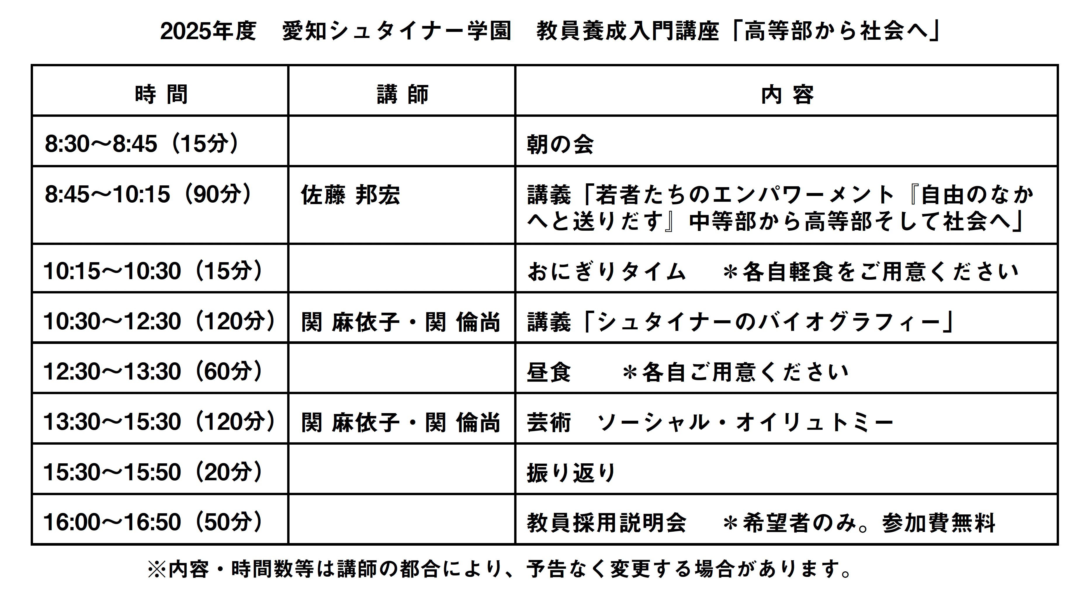 今年度は一日のみの開催です。第一講座は、北海道シュタイナー学園7年担任であり、高等部社会科(世界史・政治学・哲学史)専門の佐藤邦宏先生にお越し頂き、生徒の成長・発達段階をふまえ、中等部から高等部の社会科について、第二講座は、オイリュトミストでもあり本校で美術の外部講師を担当する関麻依子先生とパートナーの関倫尚先生に、シュタイナー教育に通底するアントロポゾフィー(人間とは何か?の意)・R.シュタイナーの人間観・教育観について講座をお願いします。午後には第三講座として、関先生によるソーシャル(社会/働く場所における)オイリュトミーも体感できます。